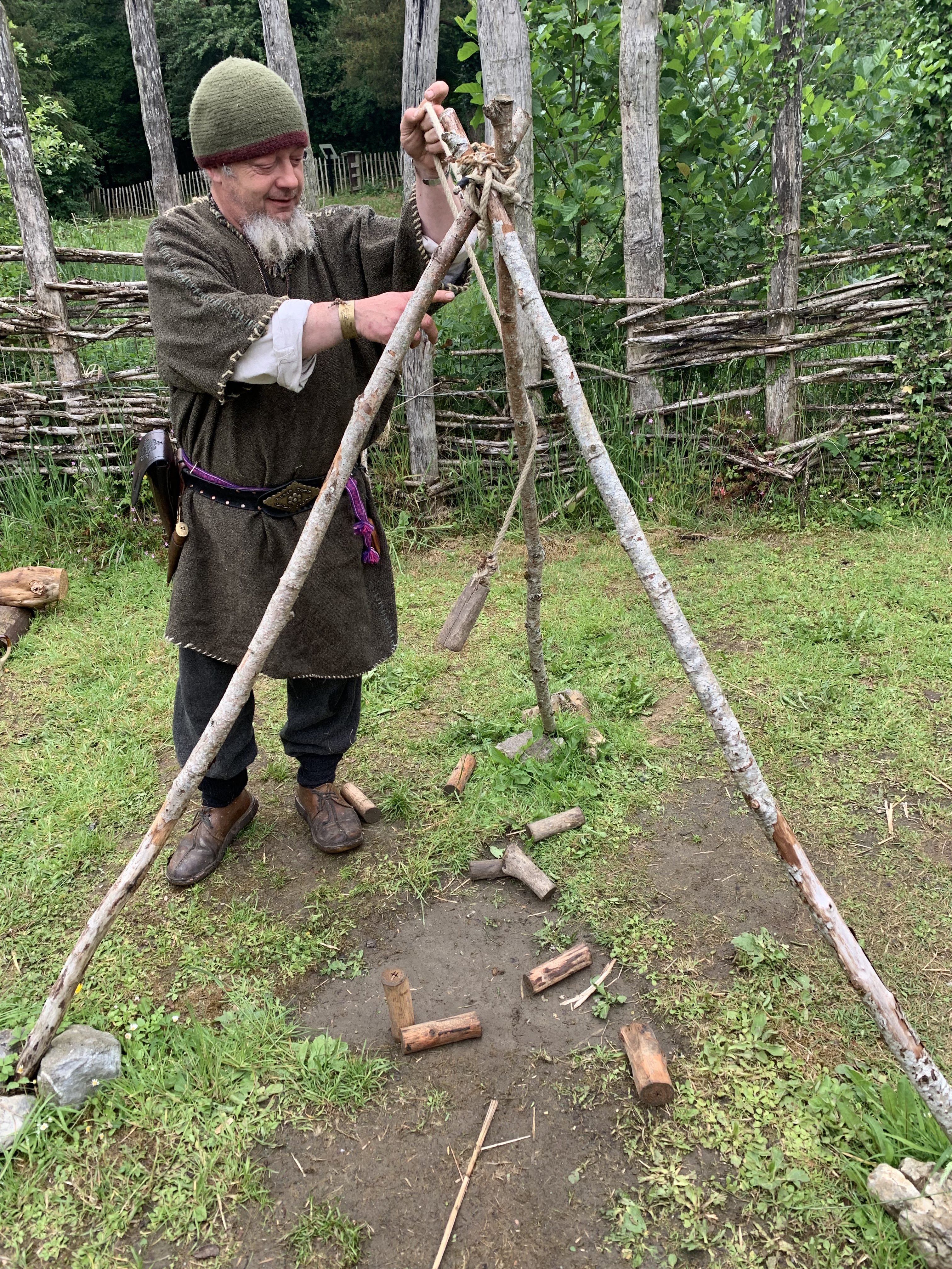 I would like to preserve for the record that I knocked down 8 of 9 pins on my first attempt. The re-enactor stated that his record was 7 of 9. I’ll also say that I think my attempt was invalid because it looped over the tripod.