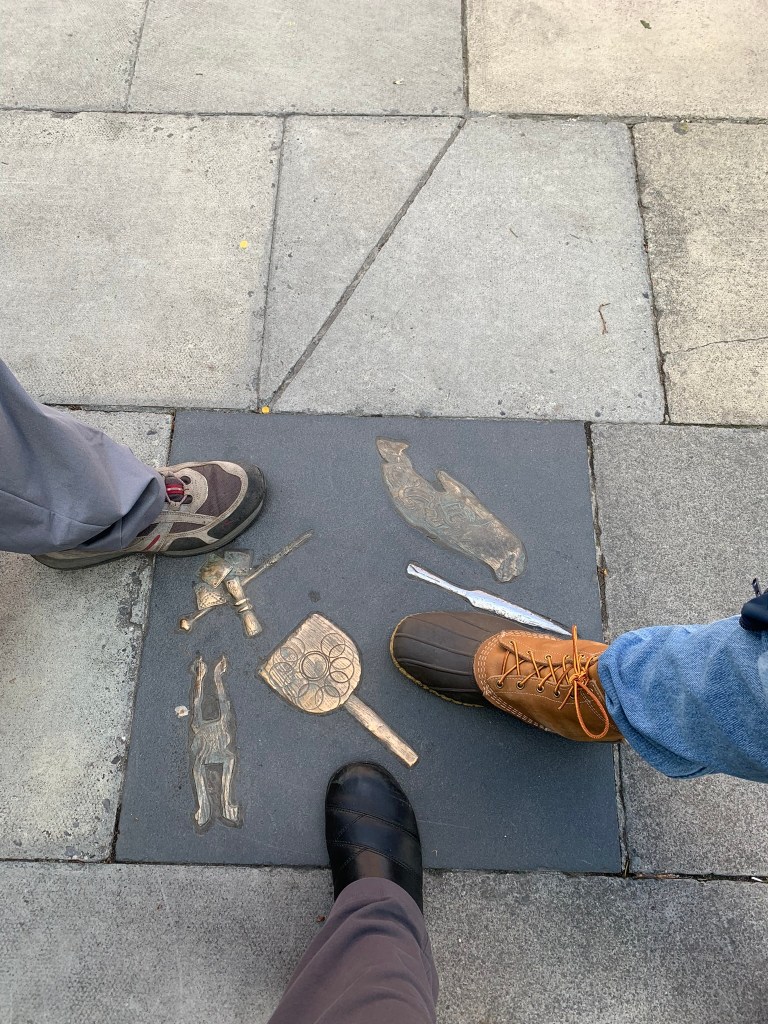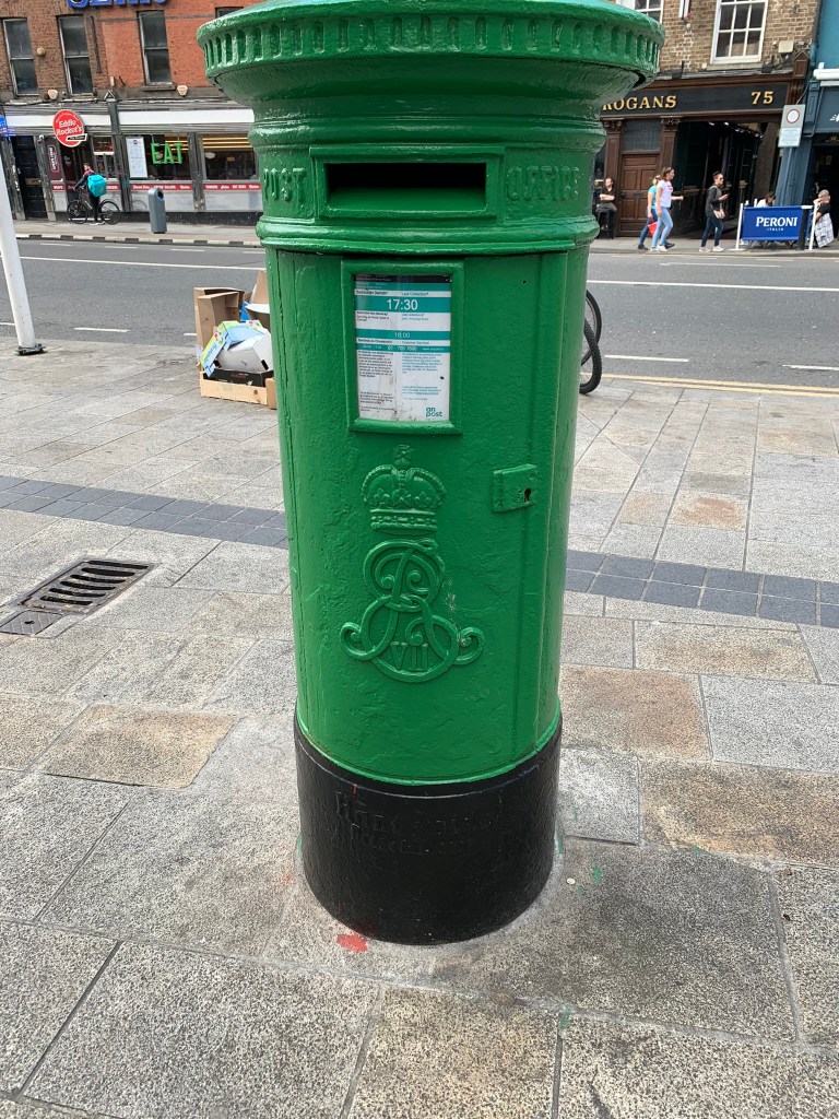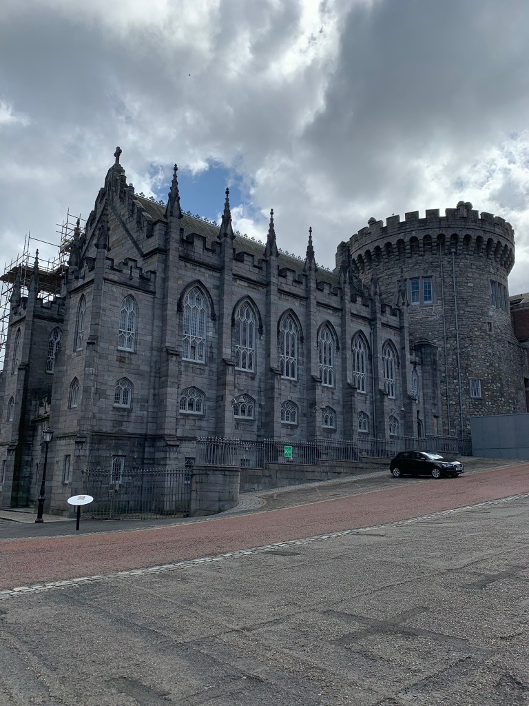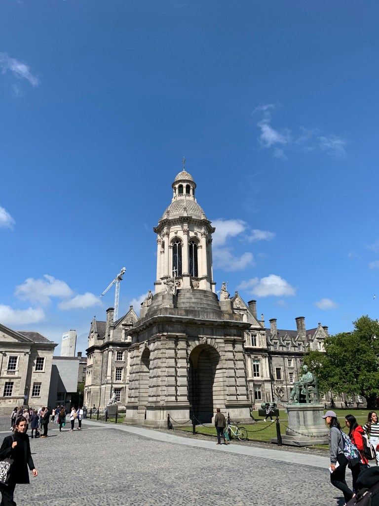 Trinity College is beautiful; however I would note some of the newer buildings — concrete block — would not look out of place on a SUNY campus or another other college that was building in the 1960s. The crowds around the Book of Kells were huge. I definitely wore a mask inside. (Side note: we saw very few people wearing masks during most of the trip.) I was able to listen to the audio tour but unfortunately it didn’t work for Charles 😦 Much of the exhibit was about the history and creation of the book. The book itself is kept in a dark room in a special case; you can only see the single page on display. It is an amazing artifact, just wish we could have seen more of the individual pages.