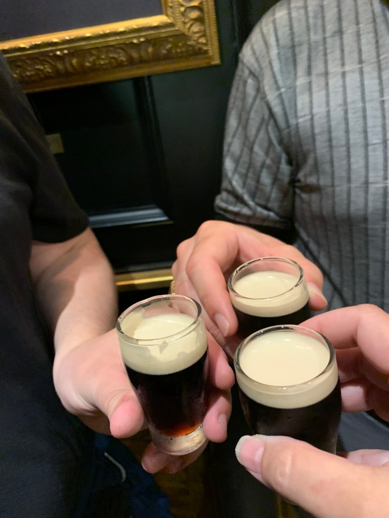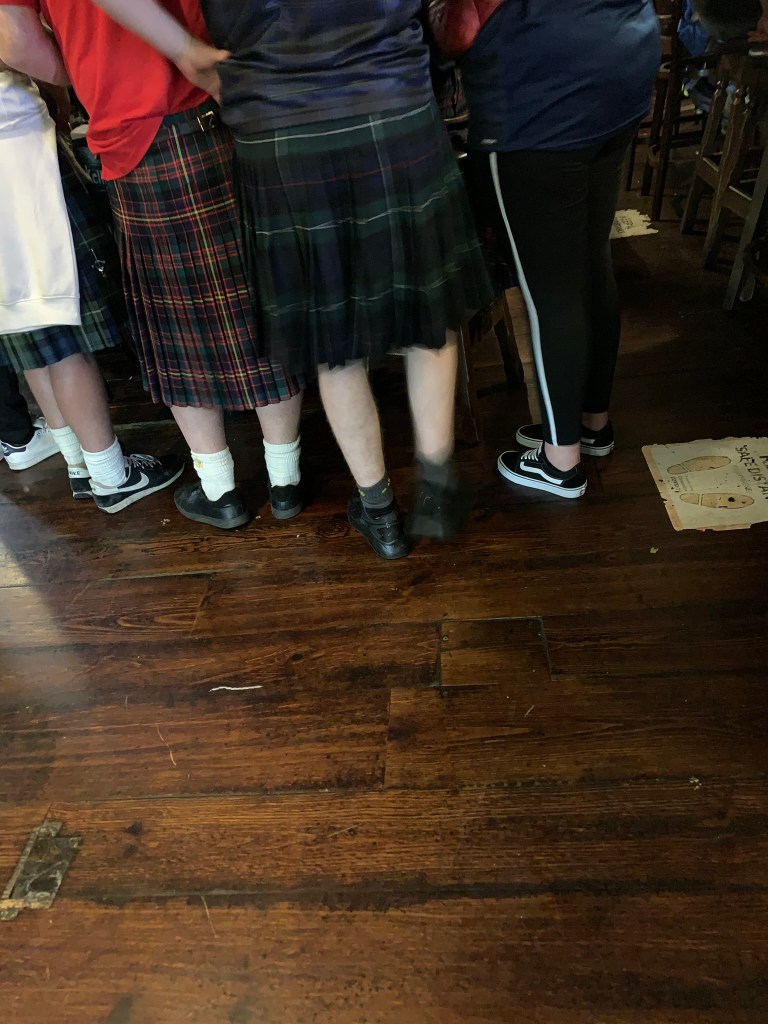 It was late in the afternoon and we wanted to get dinner but all the food locations at the storehouse were closed. We took a taxi (easy and smart decision) to Darkey Kelly’s. I had bangers and mash (no picture!)…Greg and Charles had a pint and Charles had a shot of Powers Whiskey. The live music started around 7; I was amused by the Scottish lads who appeared to be in town to see their team.