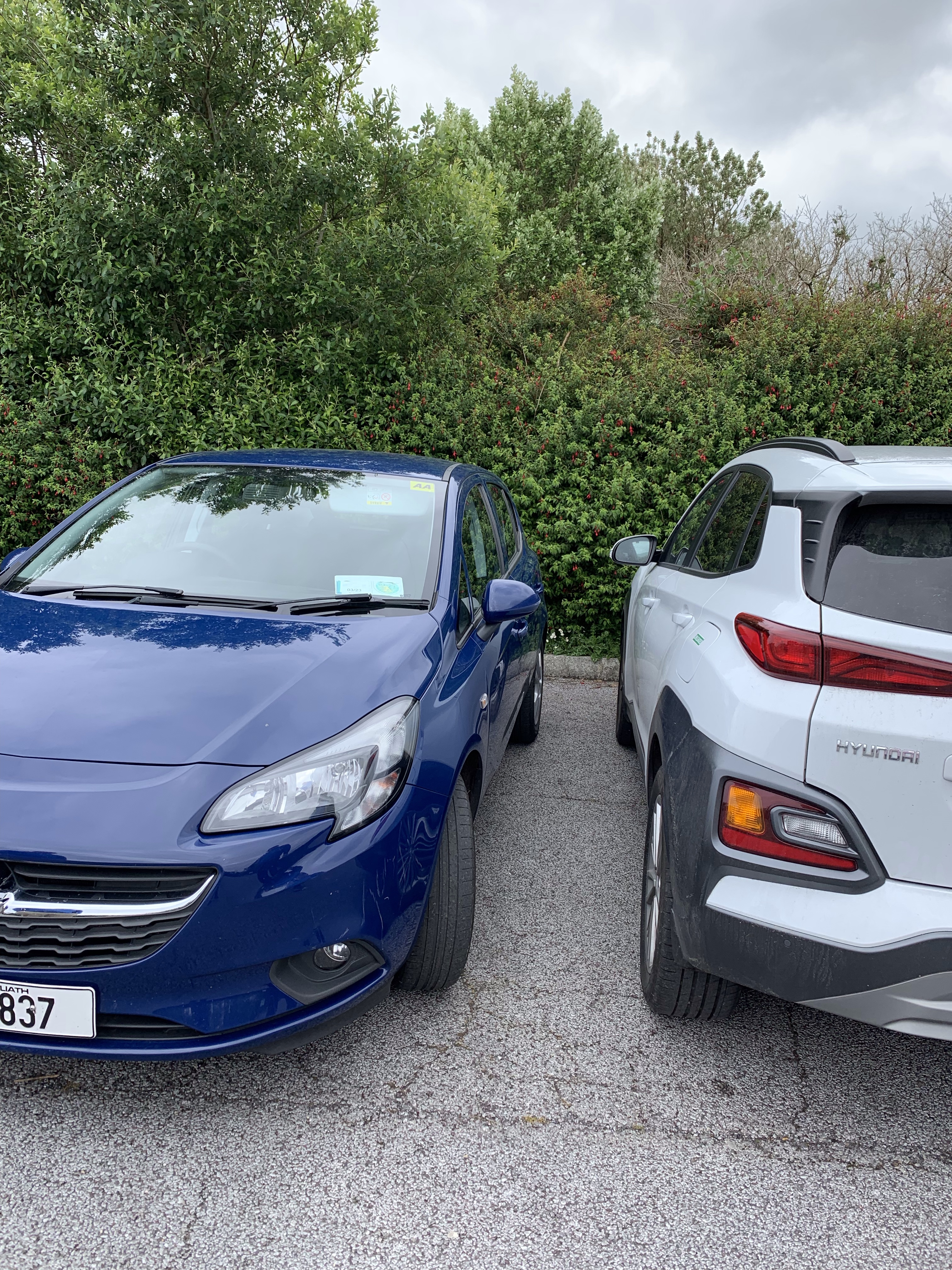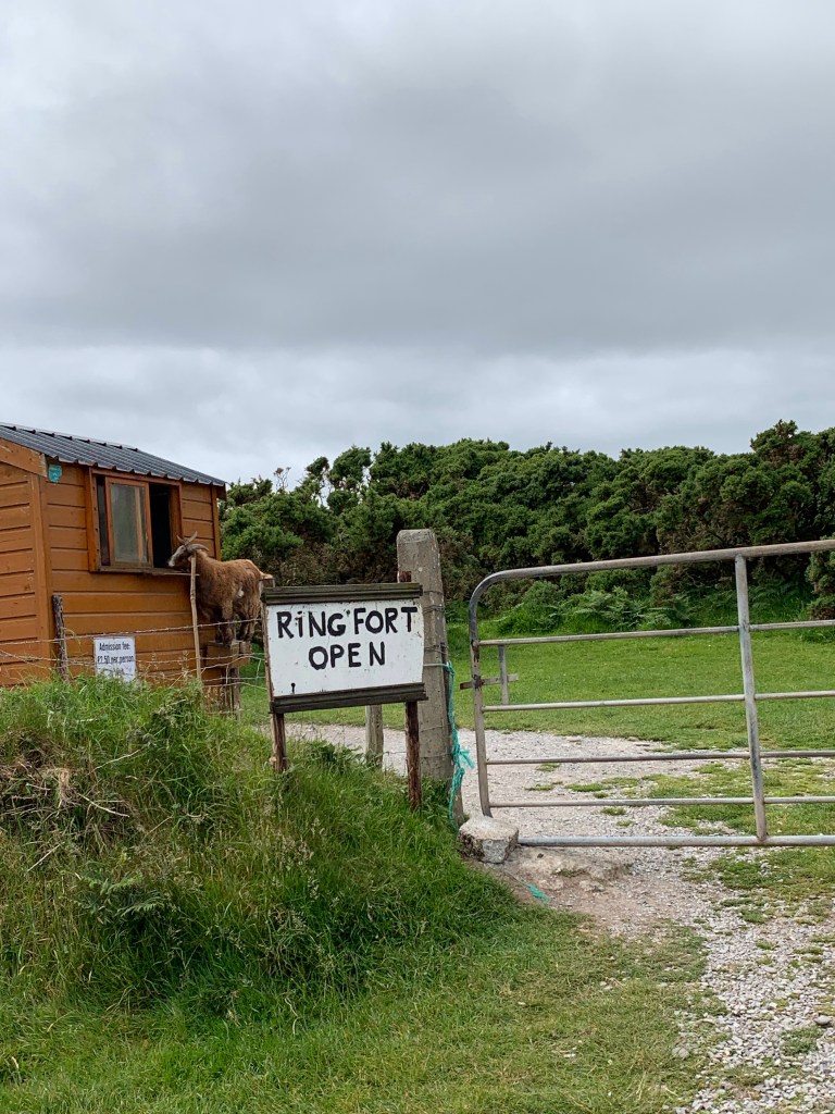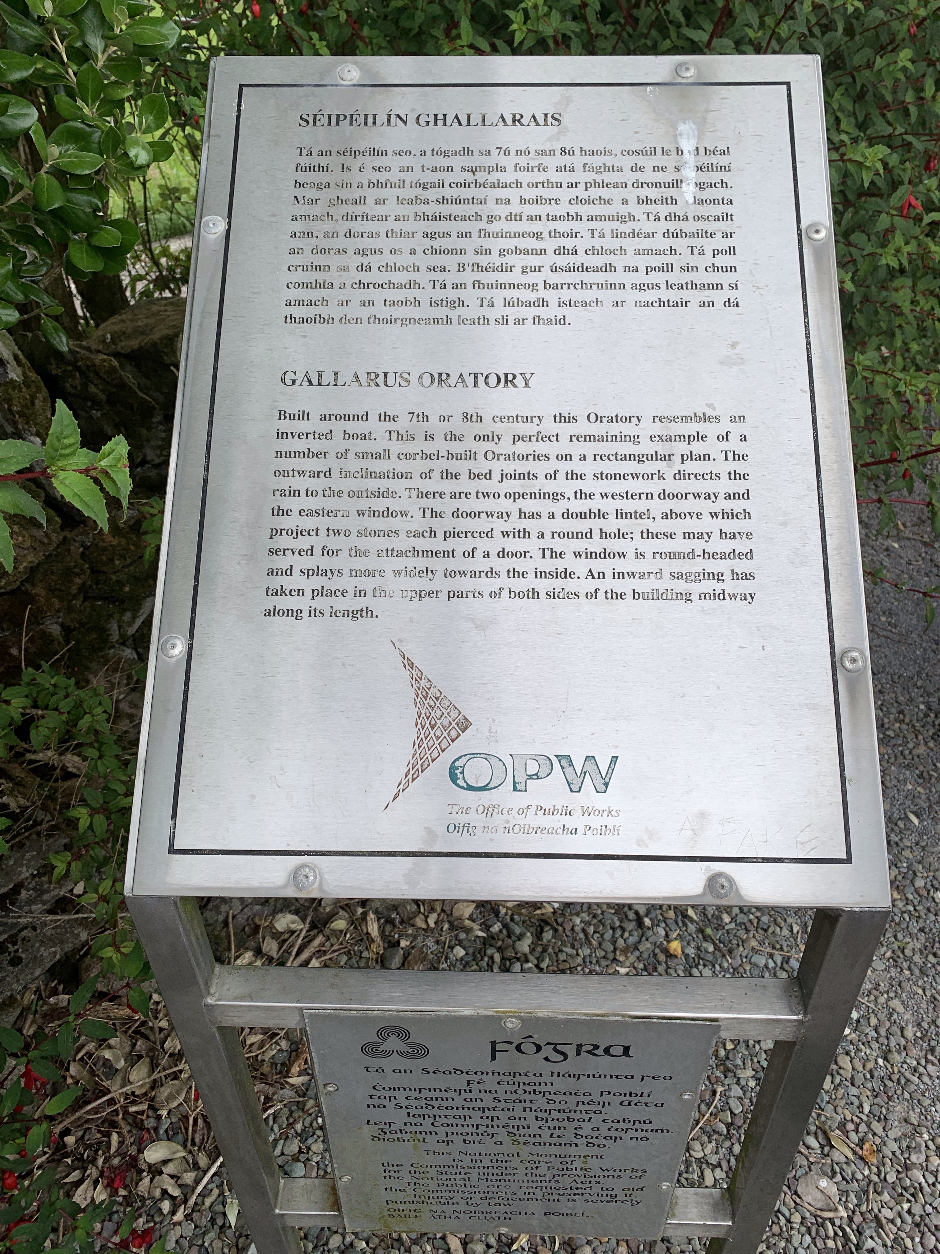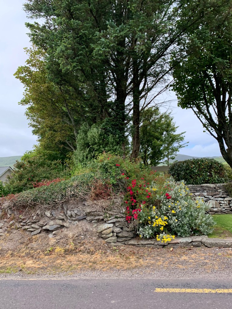 The Gallarus Oratory is an intact chapel building in the shape of an upside down boat. It may be 1300 years old. It isn’t very large and it is dark, due to the lack of windows. Along the path to the building was a hedge of fuschia. Clearly a different growing climate. As we walked back to our car, another vehicle was parked extremely close. The last picture shows the state of the parking lot (the only two cars!) Maybe we looked friendly?