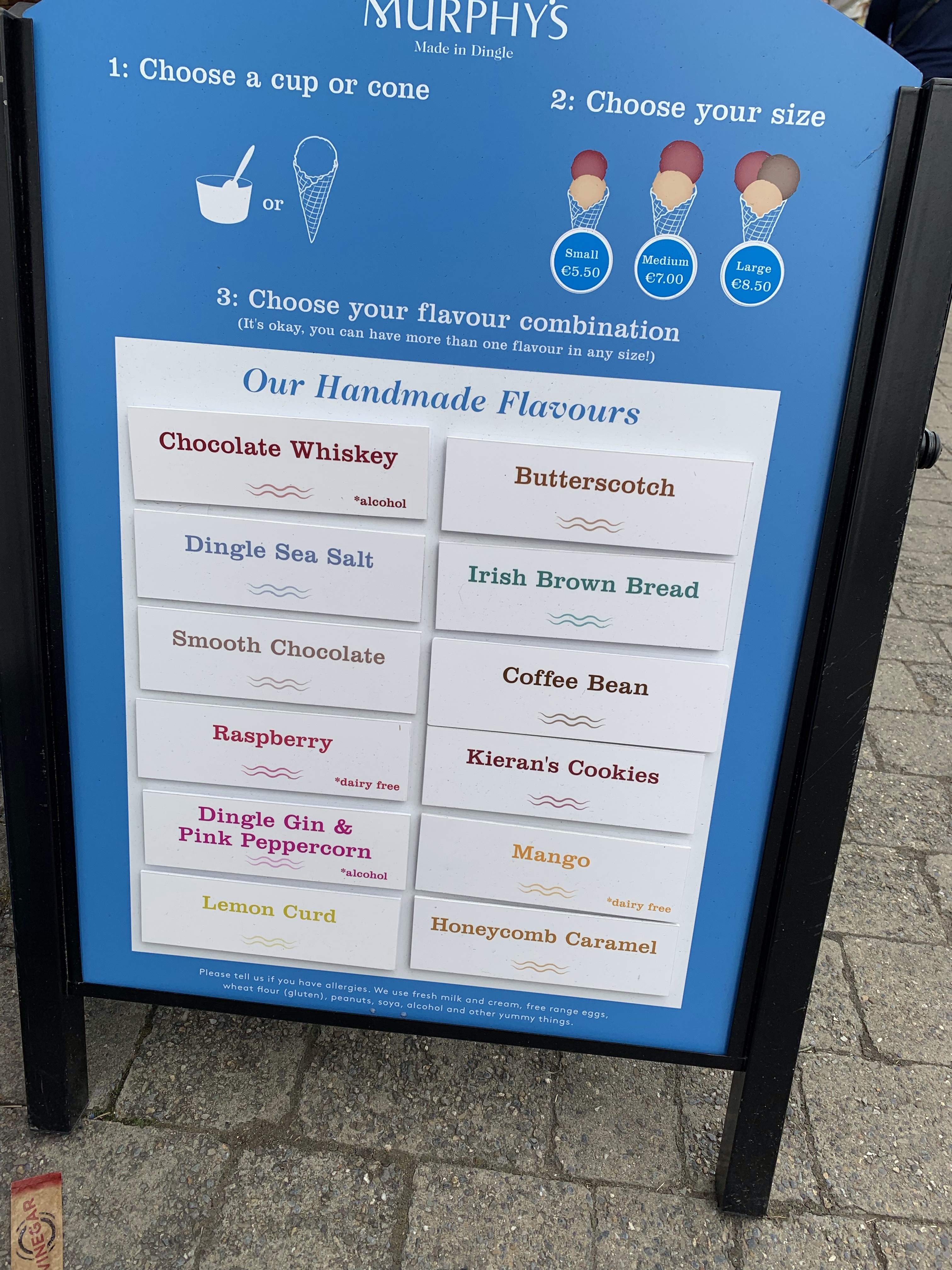We had an early dinner at the Dingle Pub and listened to a live traditional band. We walked around a bit more and stopped for ice cream; I chickened out and did not get the Irish Brown Bread! But the Kieran’s Cookies and Smooth Chocolate combo was delicious.