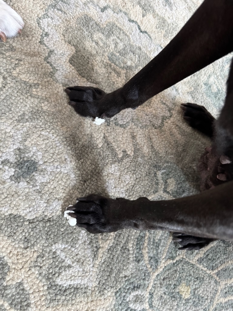 She was probably part mountain-goat. There was not a piece of furniture she wouldn’t climb. Wendy came into the kitchen a few weeks ago and found her standing on top of the kitchen table; that explains the chewed up tissues from the box at the far end of the table we would occasionally find. She ate furniture: a destroyed coffee table, chewed/scratched couches, and nips on the grandfather clock made by Charles’ grandfather. She destroyed the two oriental rugs on the first floor. Shoes, gloves, a pom-pom but not the hat, a plant. A ripped open bag of mini-marshmallows, although she ate only a few. She had a cast iron digestive system as we had ample evidence that the things she destroyed were, in fact, eaten.